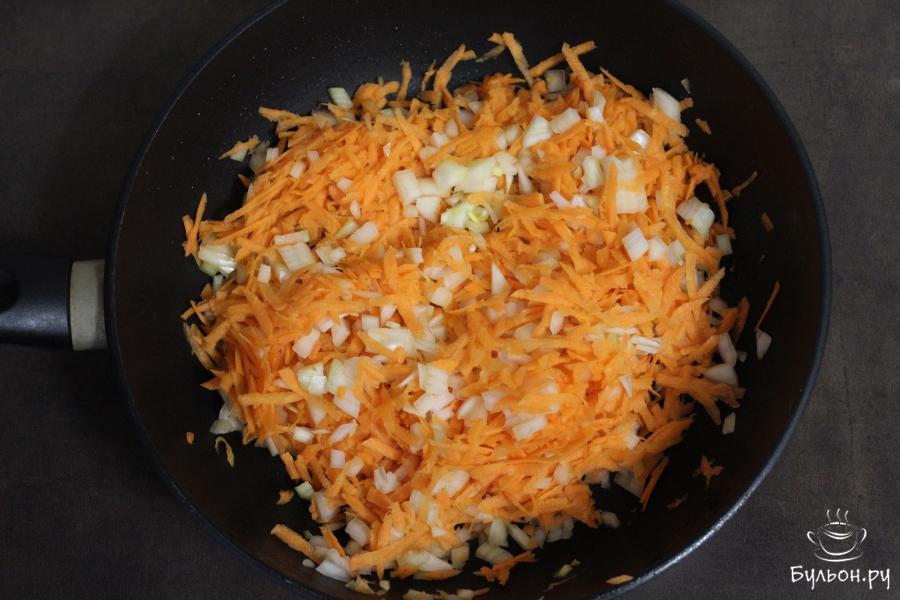 2. Пока варится горох, на растительном масле обжарьте натертую на крупной терке морковь и с нарезанным, кубиками, луком.