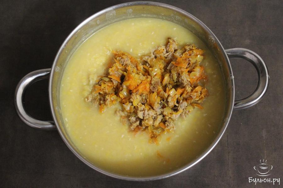 3. К обжаренным овощам добавьте тушенку, разобранную на кусочки, перемешайте и тушите, примерно 10 минут.