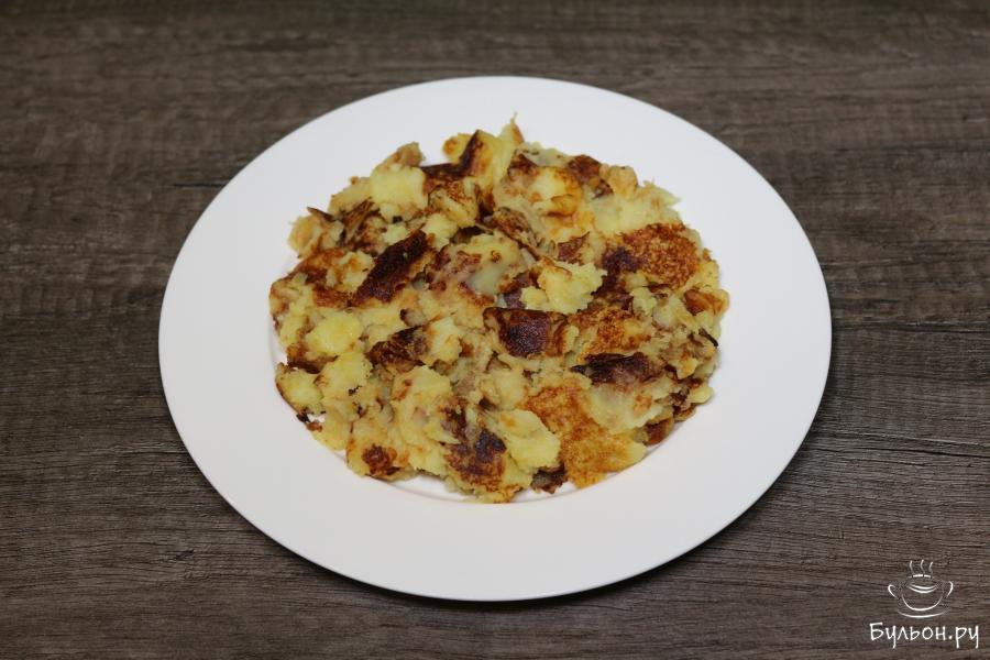 Всем известно что, только что, приготовленное картофельное пюре, имеет воздушную, легкую, однородную текстуру. Но после того, как оно остынет, оно уже совсем не такое, оно теряет эти свойства. Но его можно сделать, также, очень вкусным, просто обжарив его на сковороде до золотой хрустящей корочки. Жареное пюре из картофеля - это отличный вариант гарнира, очень вкусный, оно имеет свой вкус, совмещая вкусы пюре и жареного картофеля. Отлично сочетается со всем: и с мясом, и рыбой, и птицей, и. овощами.