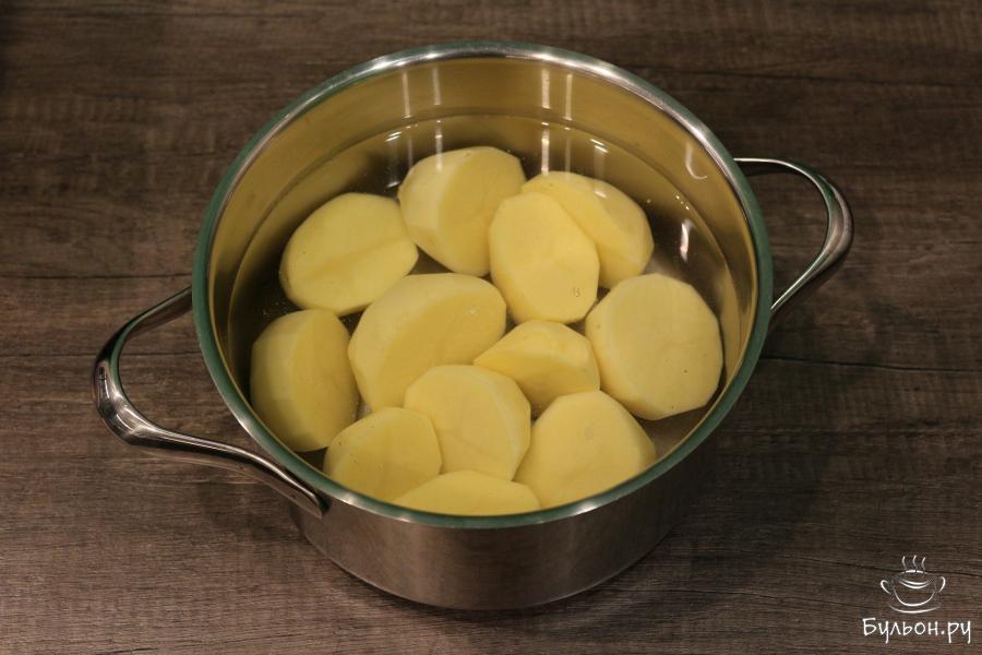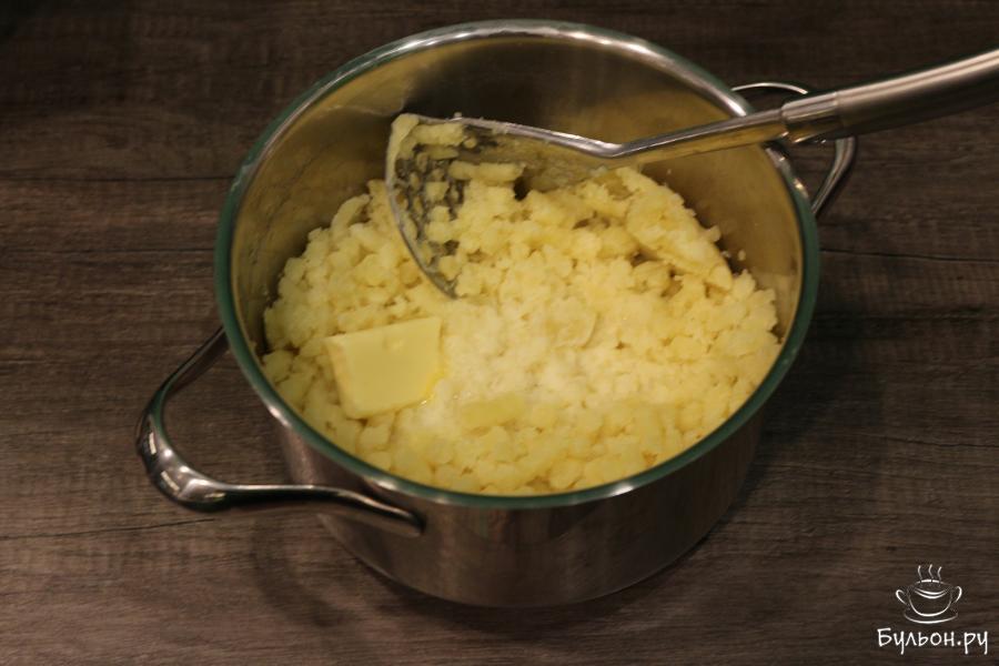 3. Когда картофель будет готов, слейте воду. Молоко нагрейте на плите в отдельном ковшике. Разомните картошку толкушкой так, чтобы не осталось комочков, добавьте горячее молоко и сливочное масло. Еще раз размешайте все с помощью толкушки.