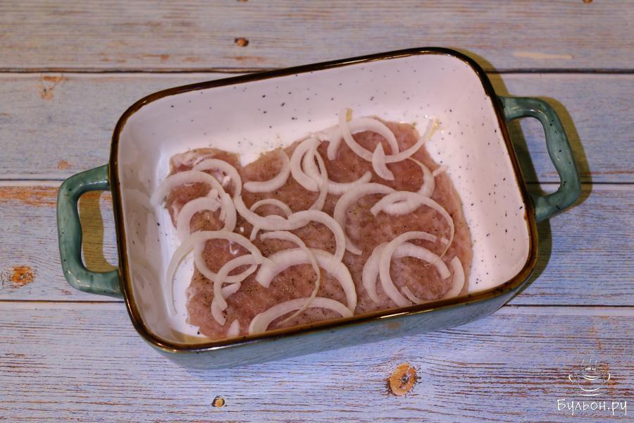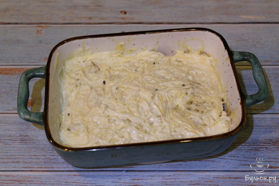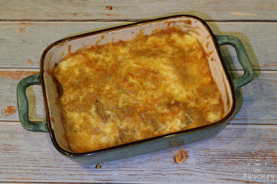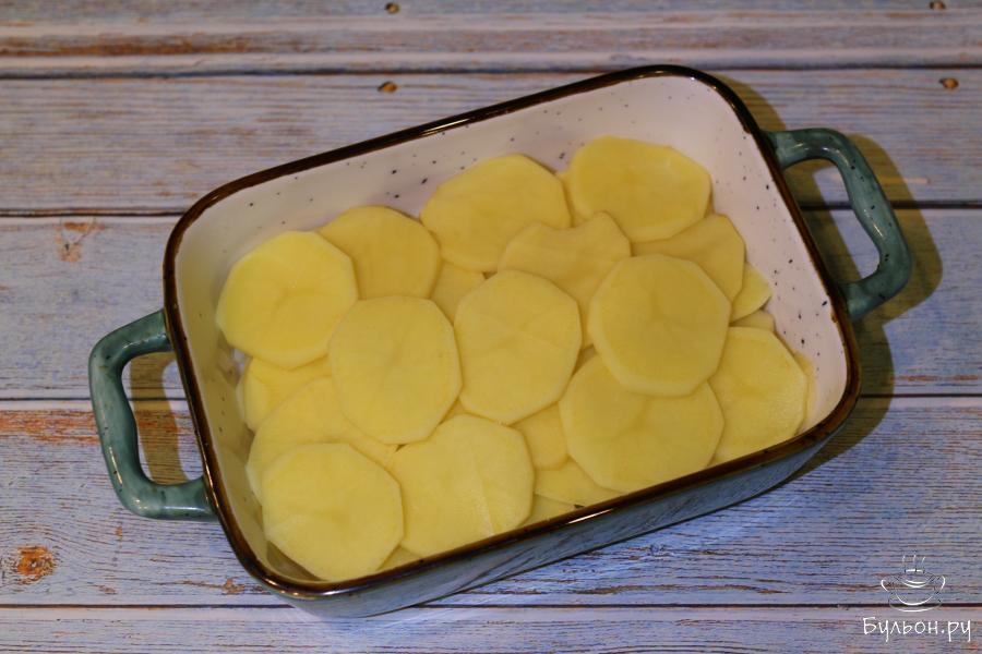 6. Сверху на лук, выложите нашинкованный картофель и поставьте форму в разогретую, до 180 градусов, духовку. Готовьте так минут 15-20. Как только у краев картофеля начнет появляться золотистый краешек, форму накройте крышкой или фольгой, и продолжайте выпекать блюдо еще минут 20.