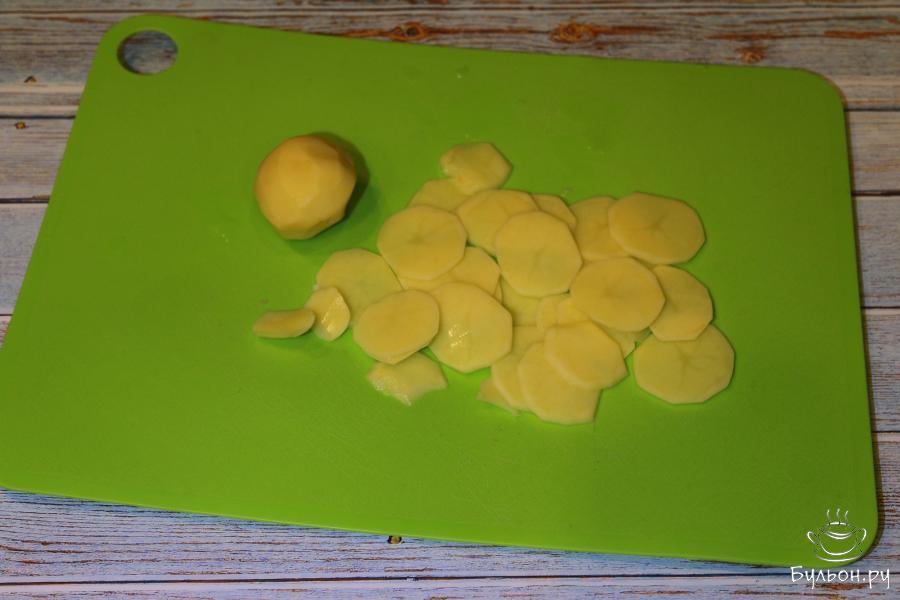 5. Картофель очистите и тонко нашинкуйте. Я использовала мелкий картофель, чтобы кружочки были небольшими и их красиво можно было уложить.