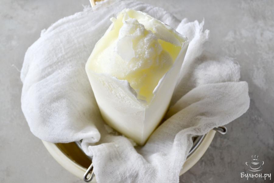 2. Разрежьте пакет и поместите замороженный кефир в дуршлаг, застеленный марлей, сложенной в 3-4 слоя. Дуршлаг поставьте в глубокую миску или кастрюлю, в которую будет стекать сыворотка.