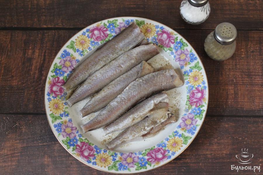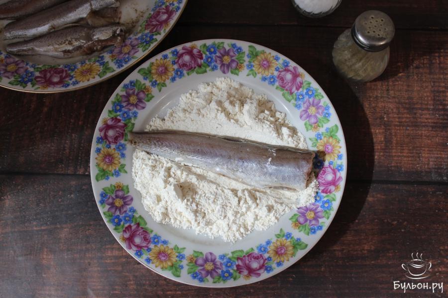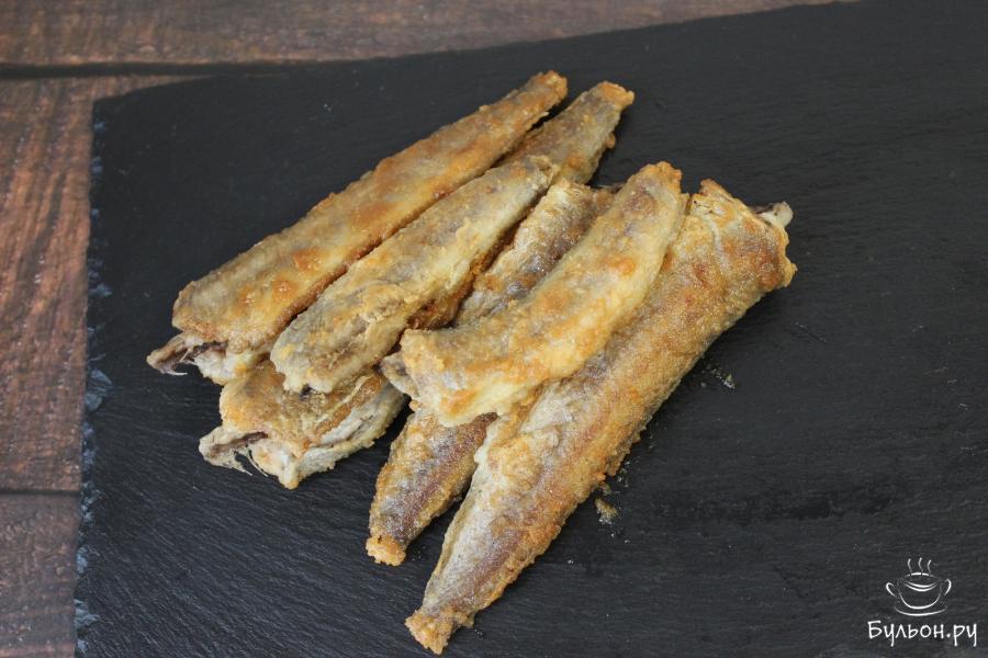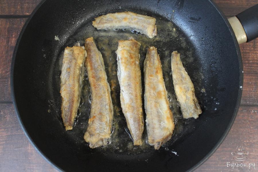 4. Выложите подготовленные рыбки на разогретую, с растительным маслом, сковороду и обжарьте с двух сторон, до золотистой корочки. При обжарке установите средний огонь, чтобы рыба успела приготовится.