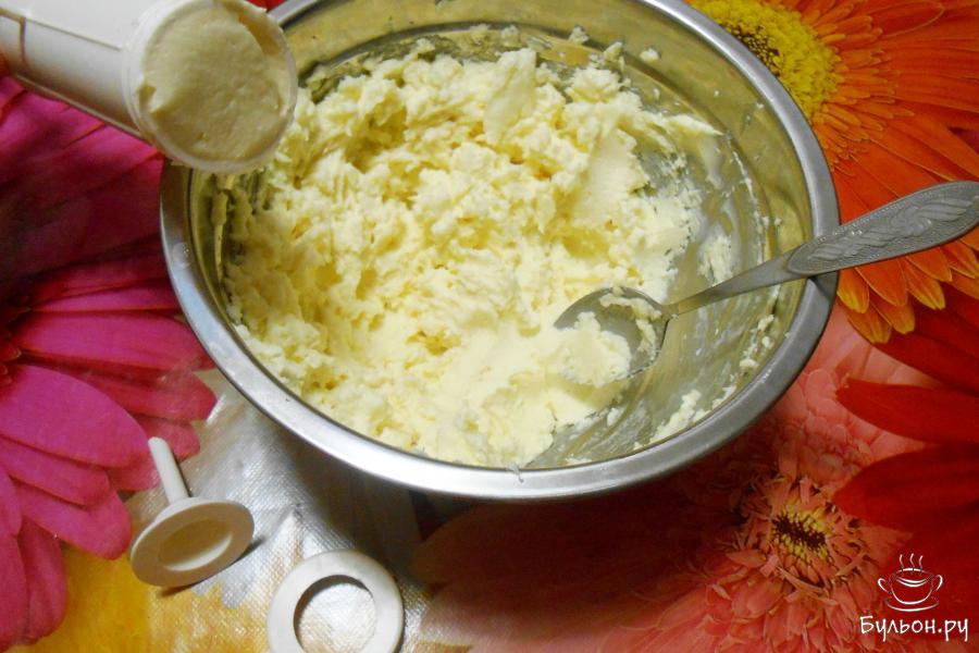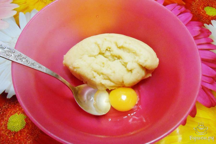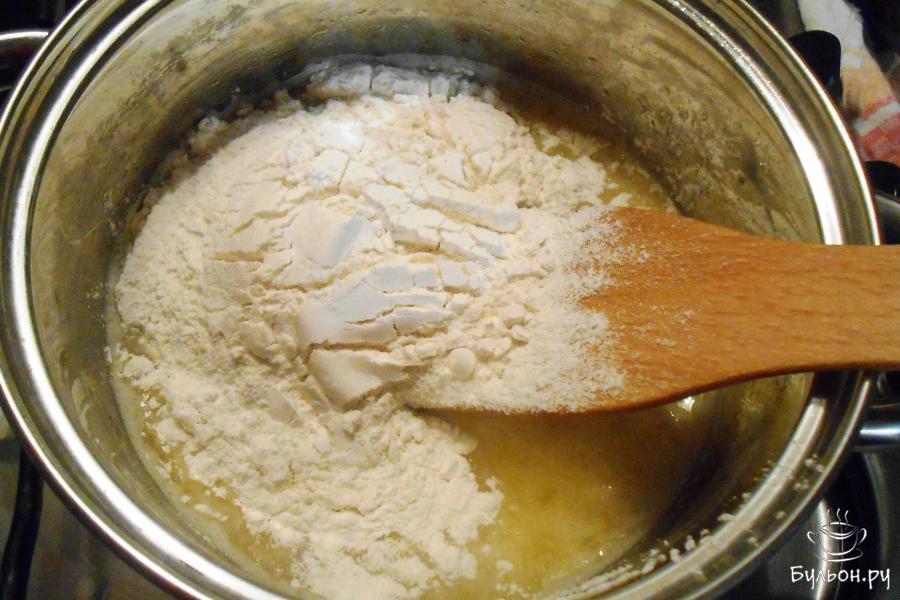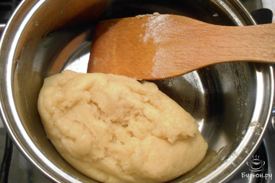 3. Быстро перемешать деревянной лопаткой, пока не образуется шар, отстающий от стенок. Переложить тесто в миску и немного остудить.