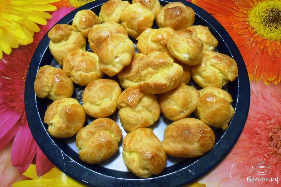 Профитроли - это французский десерт в виде круглого пирожного с кремом. Пирожные получаются нежными, мягкими и в меру сладкими. Предлагаю приготовить профитроли с масляным кремом, мне кажется это самый вкусный крем. Масло для крема должно быть комнатной температуры. Если нет кондитерского шприца, то можно сделать надрез сбоку профитроля и начинить кремом с помощью чайной ложки. Заварное тесто для профитролей приготовить очень легко и просто, соблюдая несколько советов. Яйца вбивать в тесто по одному, перемешивая до однородности. Тесто должно получиться однородным и не жидким, иначе растекутся профитроли, и не густым, иначе профитроли не поднимутся. Тесто должно сползать с ложки широкой лентой. В процессе выпечки духовку не открывать. Получается 25-30 профитролей. Подавать профитроли лучше в охлажденном виде к чаю.