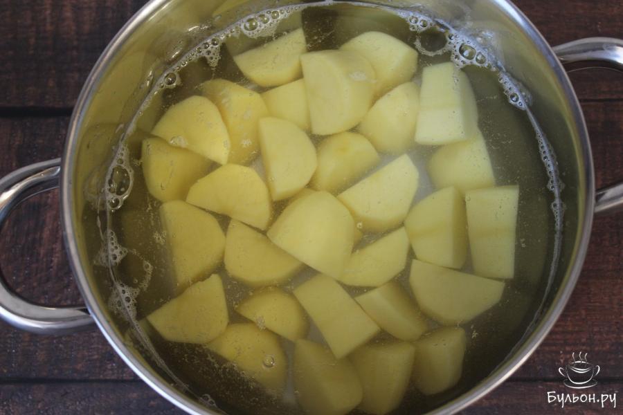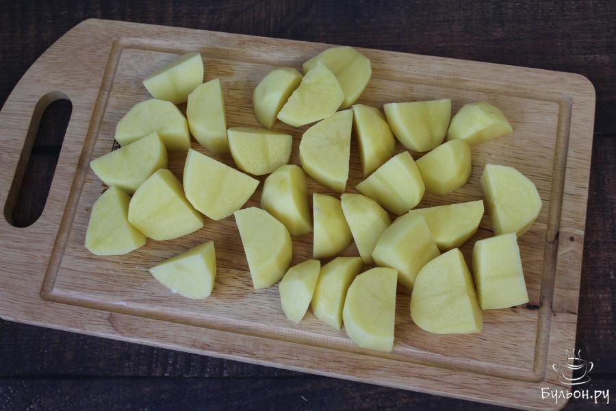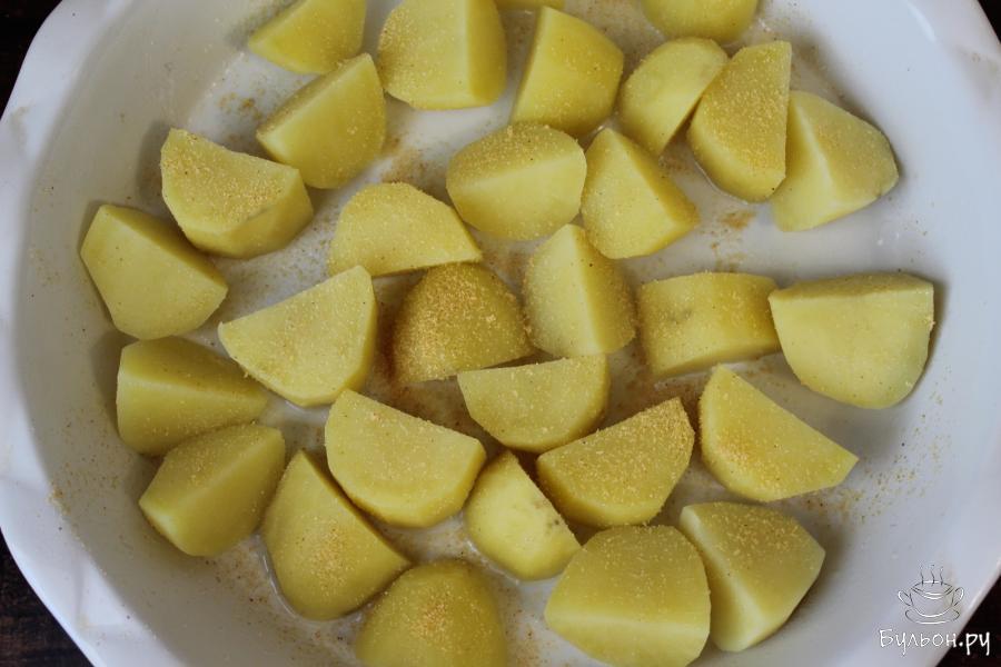 3. Затем слейте воду, переложите картофель в форму для запекания, заранее смазанную растительным маслом. Приправьте солью и сухим чесноком.