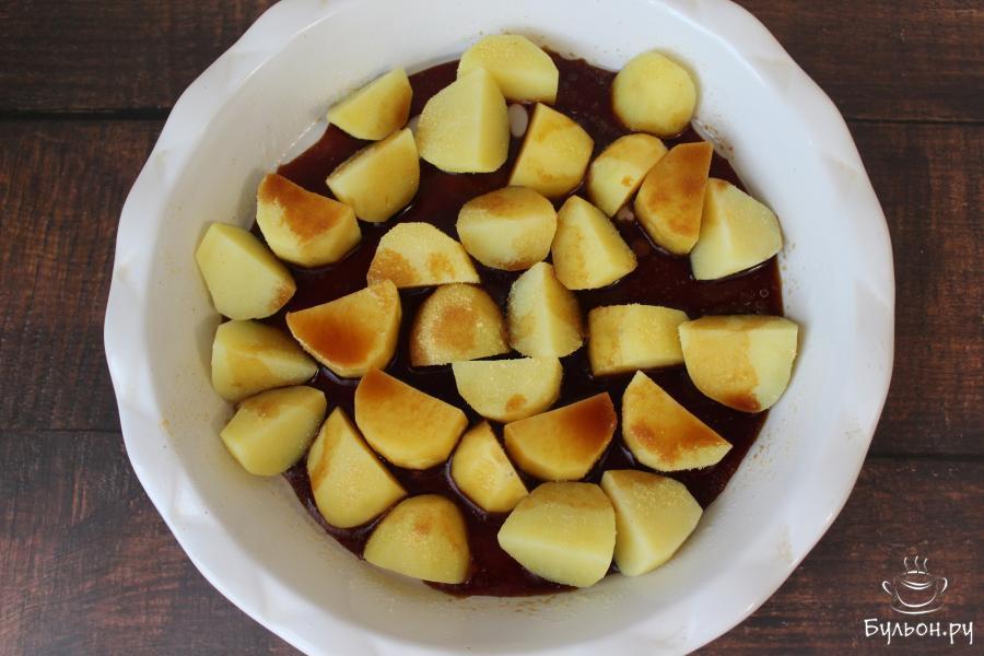 4. Влейте соевый соус и поставьте форму в духовку, разогретую до 190 градусов. Запекайте картофель 15 минут, после чего перемешайте его и готовьте еще 5-7 минут.
