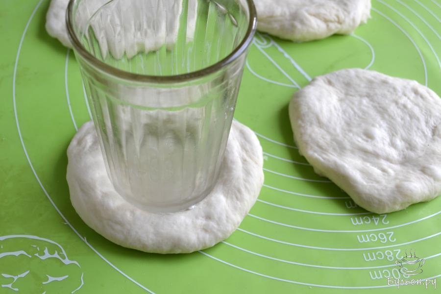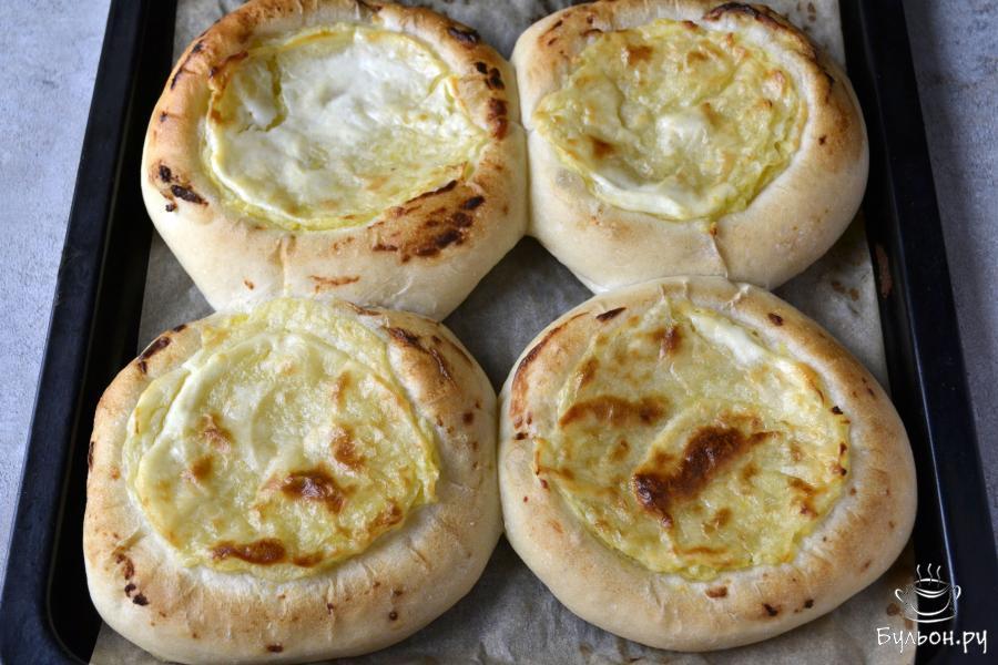 7. Переложите подготовленные лепешки на противень, застеленный пекарской бумагой и в углубления положите картофельную начинку.