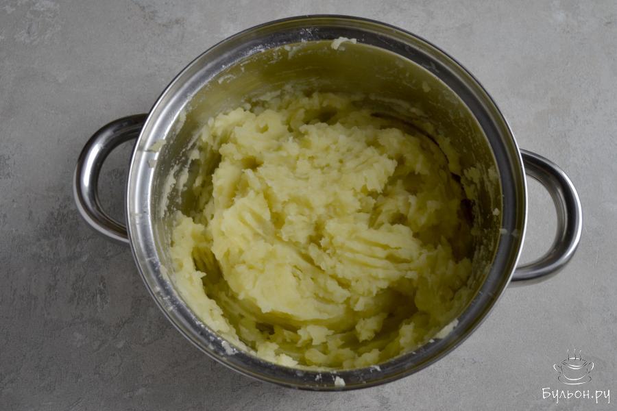 3. Сварите очищенный картофель в подсоленной воде, до готовности. Слейте воду и истолките картофель в пюре, добавив растительное масло (3 ст. л.)