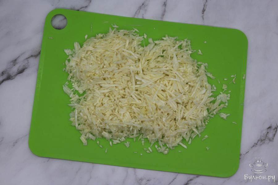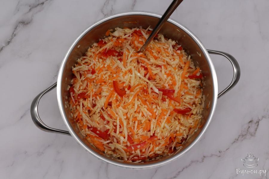2. Морковь очистите, натрите на крупной терке, отправьте в емкость к капусте. Все остальные подготовленные овощи также кладите в эту емкость.