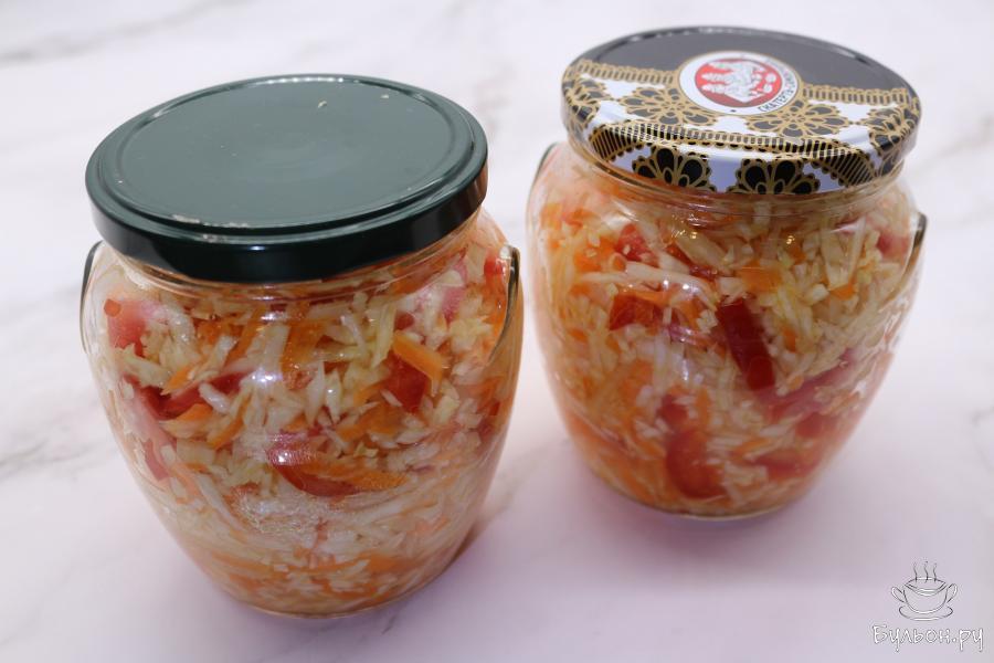 6. Переложите салат в чистые стерилизованные стеклянные банки и накройте их крышкой. Храните салат в холодильнике.