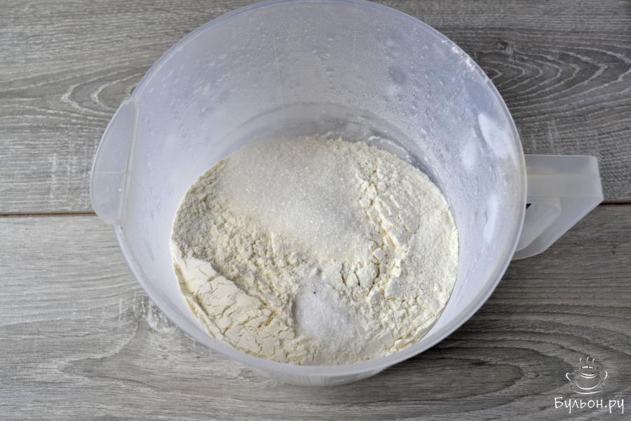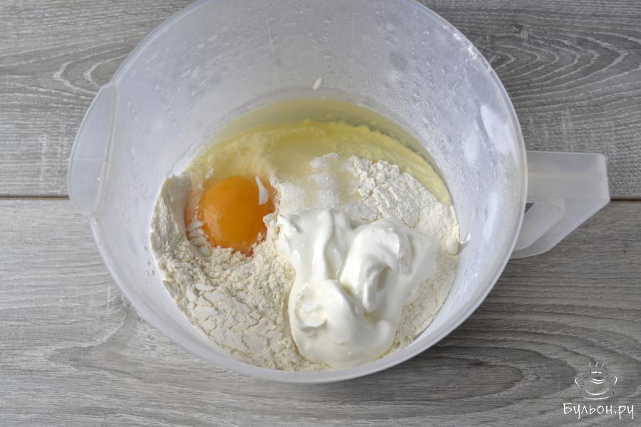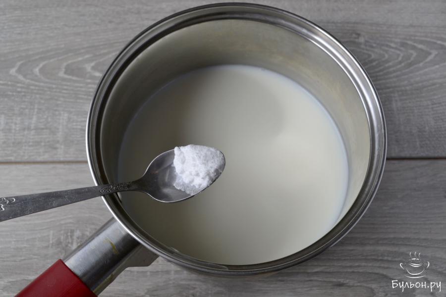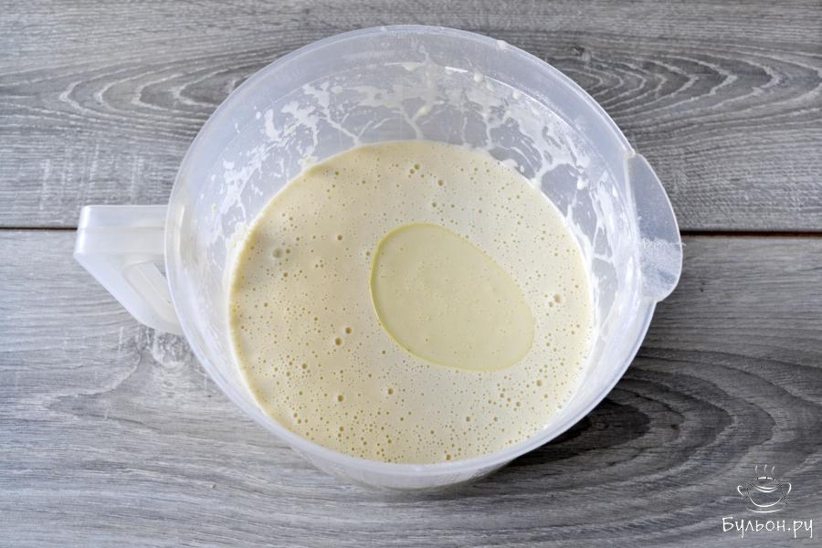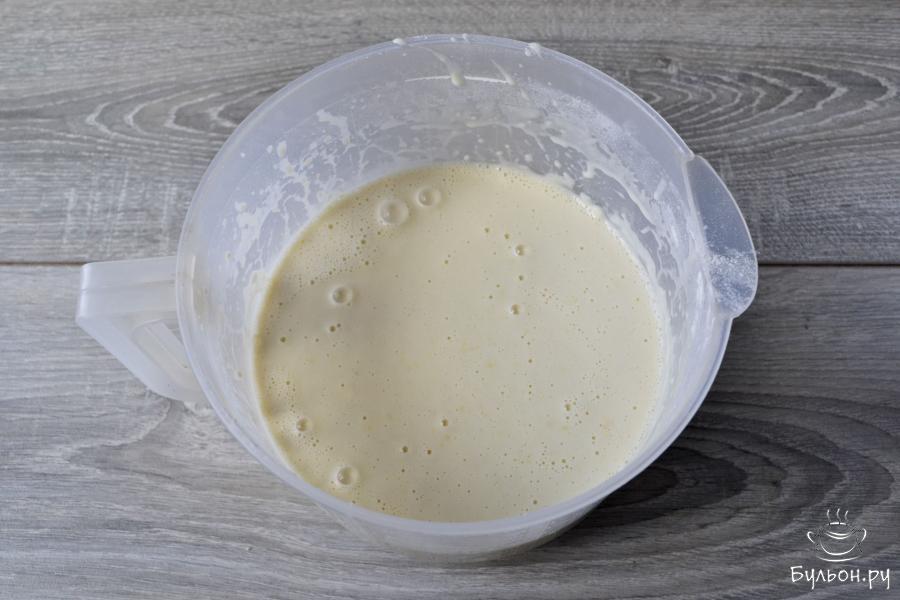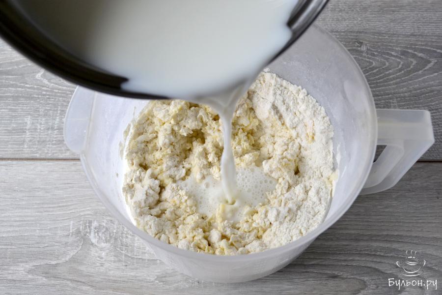 5. Миксером тщательно размешайте смесь. Подливайте молоко и продолжайте взбивать тесто, пока оно не приобретет однородную консистенцию, без комочков муки.