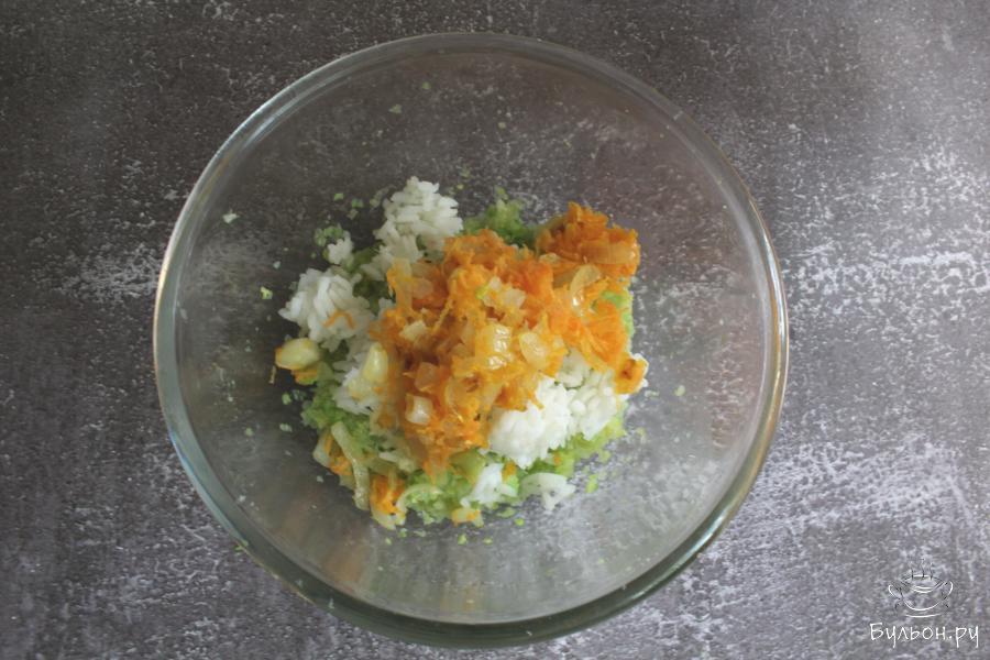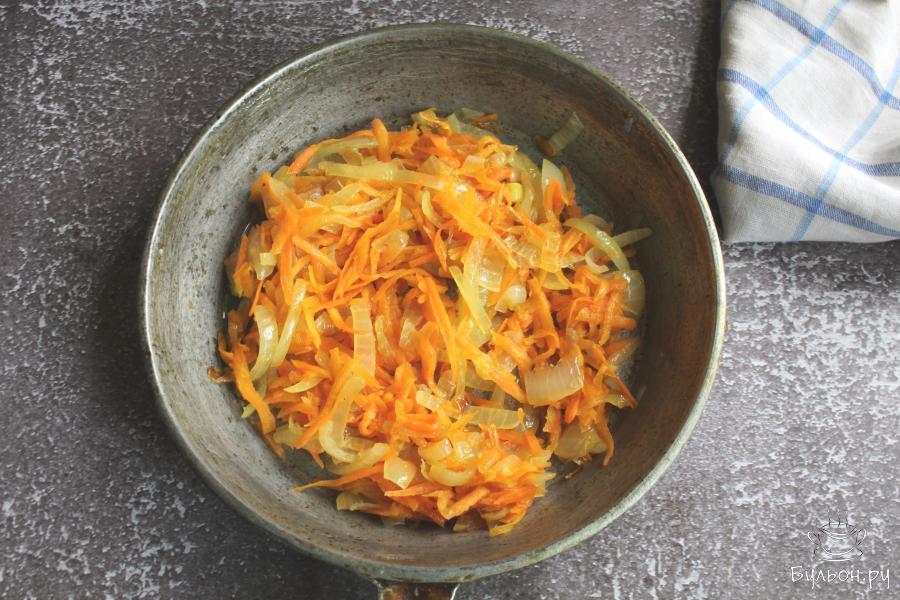 6. Морковь почистить, промыть и перетереть на крупной терке. Добавить морковь на сковороду и тушить все вместе несколько минут.