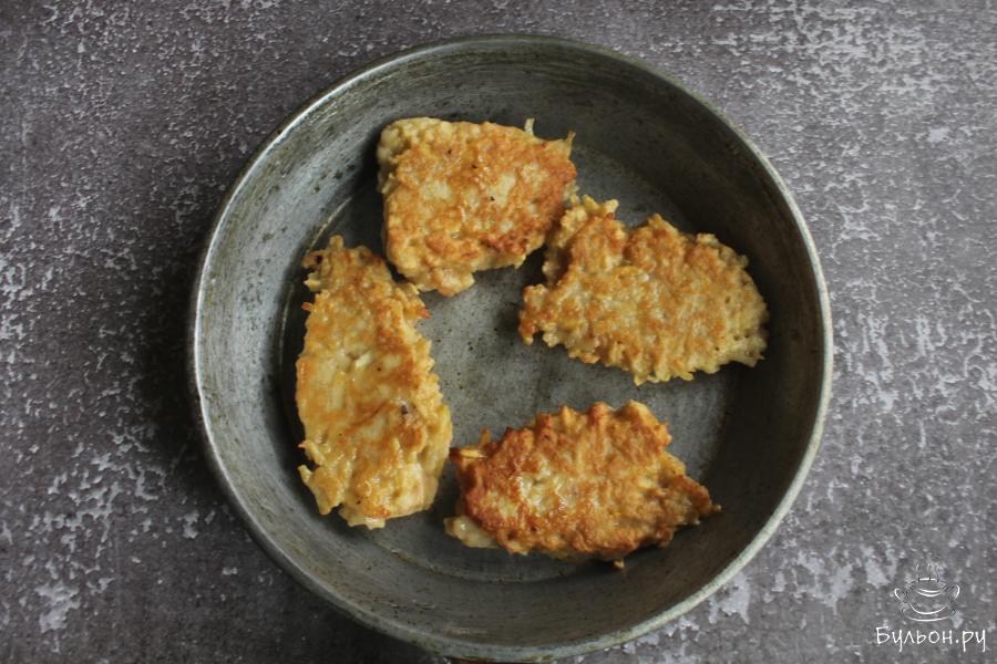 5. Выкладывать оладьи столовой ложкой, на сковороду, с разогретым маслом. Жарить оладьи, до румяного цвета, с двух сторон.