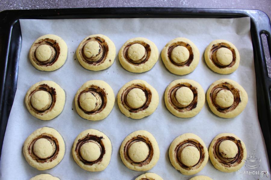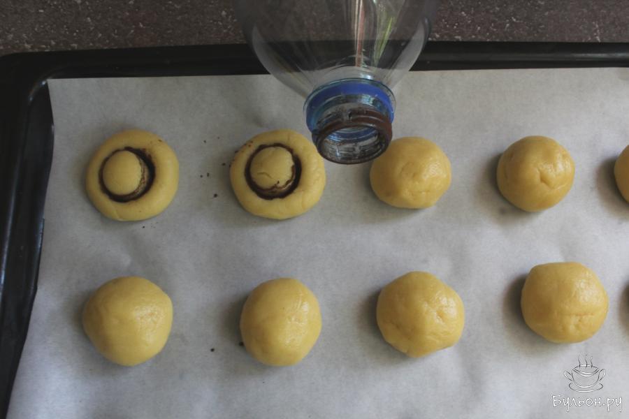 10. Вдавить горлышко в печенье, формируя "грибочки". Перед каждым печеньем обмакивать горлышко в какао.