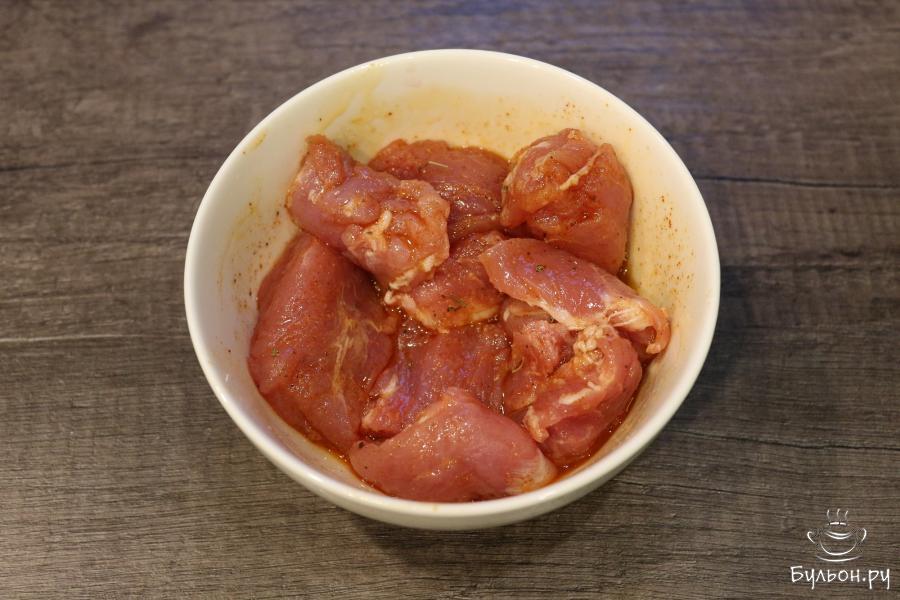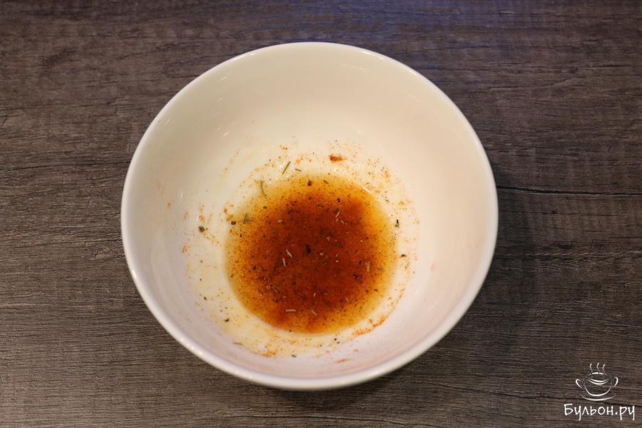 2. Сделайте маринад. Для этого смешайте растительное масло, чеснок, паприку, хмели-сунели. Соль не добавляйте, иначе мясо выделит сок.