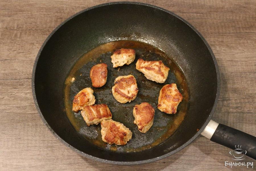 4. В сковороде разогрейте растительное масло и в нем обжарьте кусочки мяса со всех сторон на сильном огне.