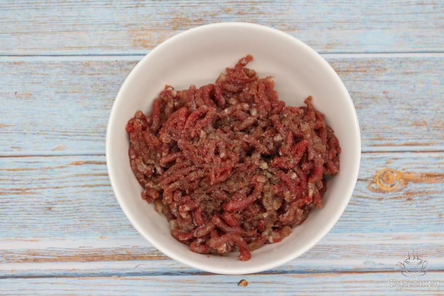 2. Лук очистите, нарежьте половинку лука на несколько частей. Говядину вымойте, обсушите и прокрутите через мясорубку вместе с луком. К фаршу добавьте соль и черный перец, перемешайте.