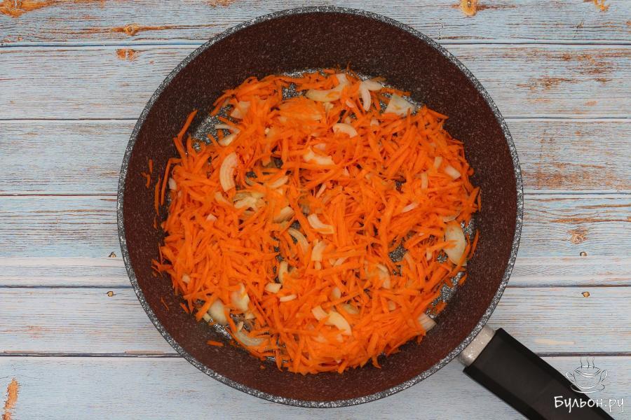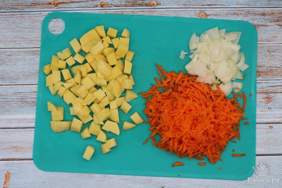 3. Очистите морковь и картошку. Картошку нарежьте кубиками, морковь натрите на терке. Другую половину лука нарежьте тонко, четверь-кольцами.