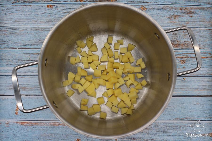 4. В кастрюлю налейте воду и положите в нее картофель. Доведите содержимое до кипения, после чего уменьшите огонь и варите суп, уже под крышкой, 15 минут.