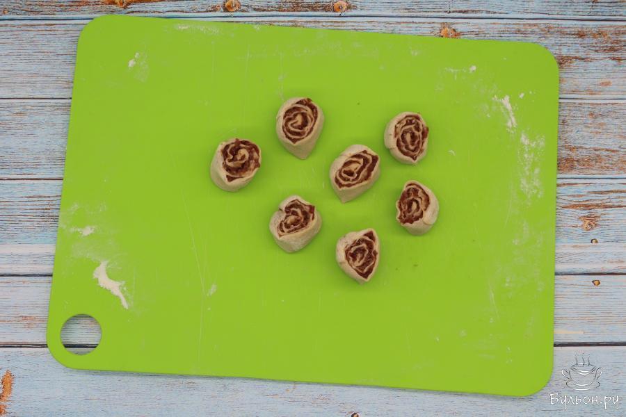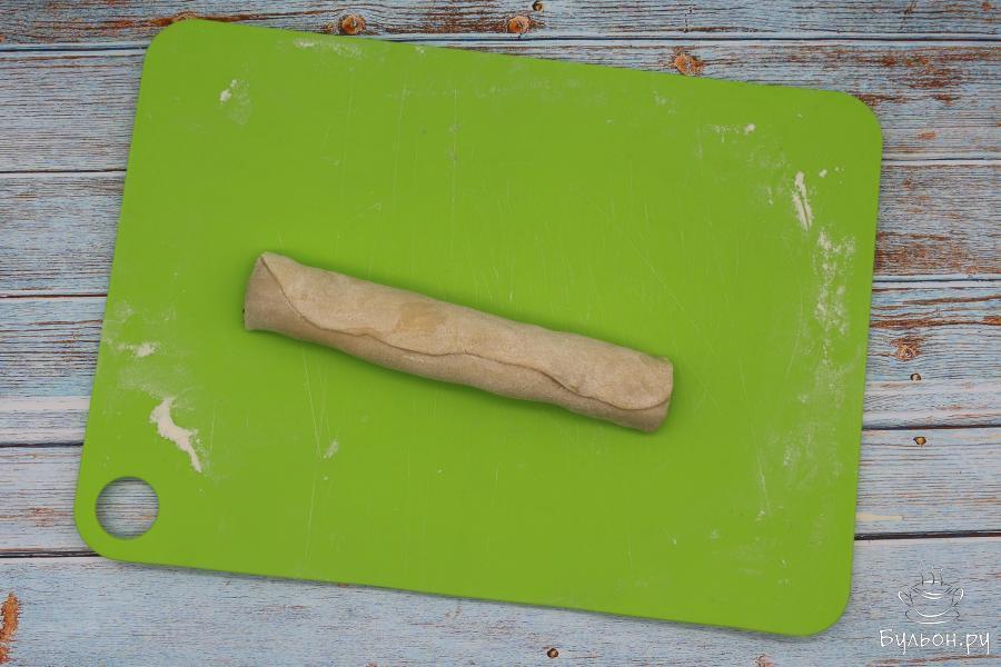 6. Фарш и тесто разделите на 4 части. Тонко раскатайте кусочек теста. Выложите часть фарша и равномерно распрелелите его по лепешке.