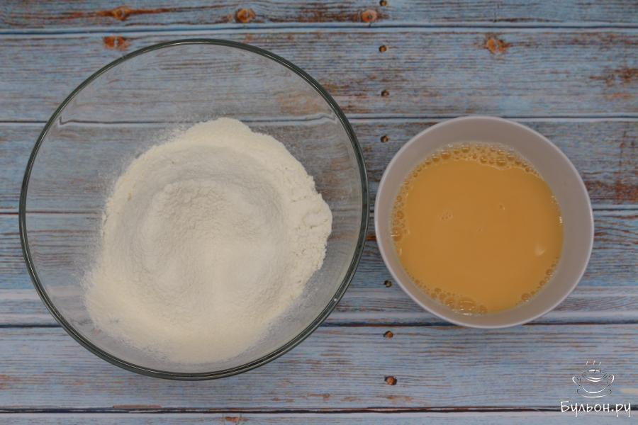 1. В емкость вбейте яйцо, влейте воду 100 мл. и всыпьте соль. Перемешайте. Затем просейте муку в другую емкость. Постепенно, вливая яичную массу, замешайте тесто. Тесто должно быть крутое, возможно потребуется немного больше муки. Готовое тесто накройте пленкой и дайте отдохнуть ему минут 20.