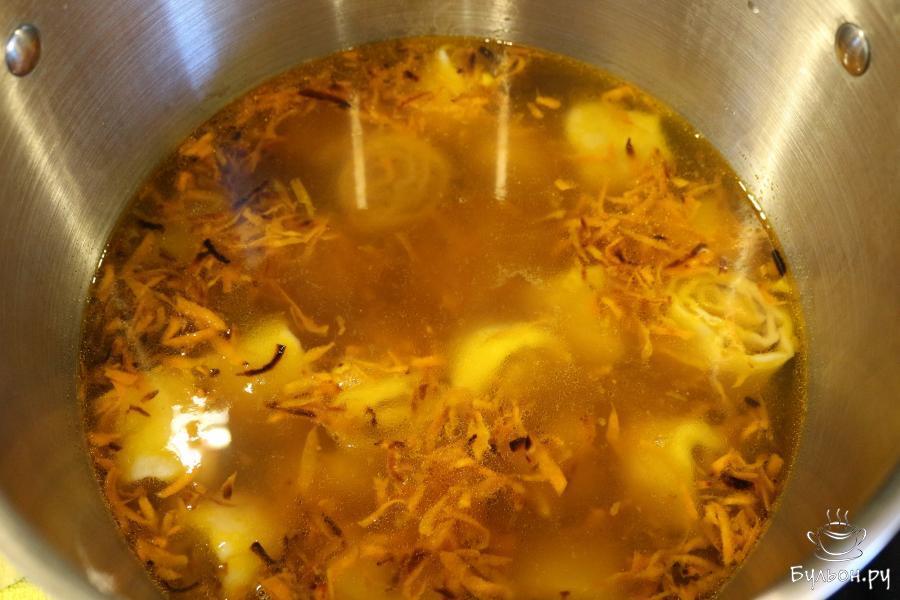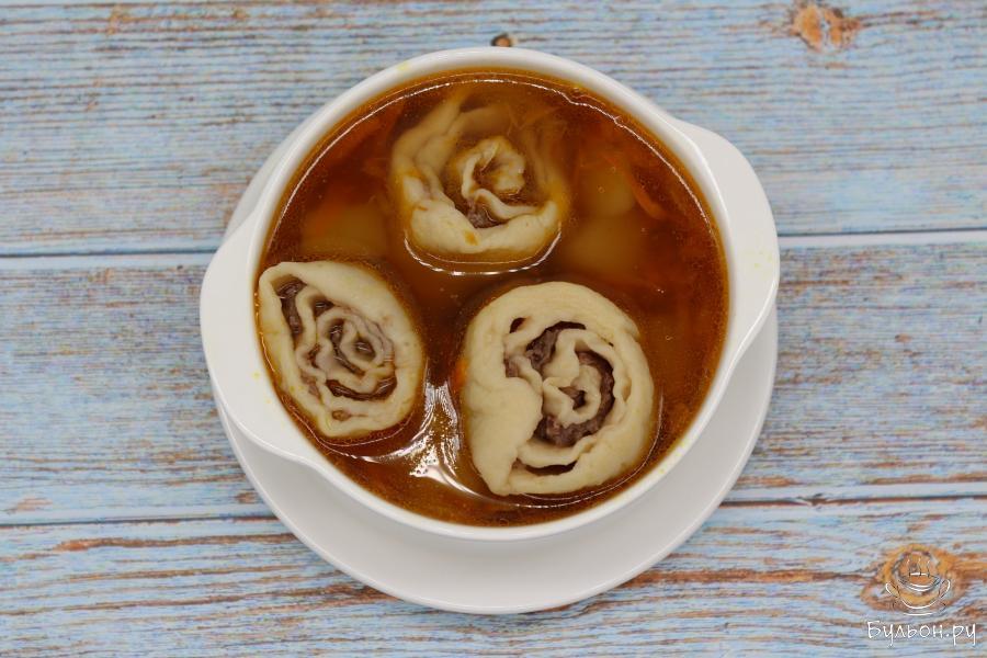 9. Теперь увеличьте огонь и добавьте в суп подготовленные рулетики. Варите суп после закипания еще 5 минут. Затем добавьте в суп поджарку и посолите. Проварите его еще 3-4 минуты и снимите с огня.