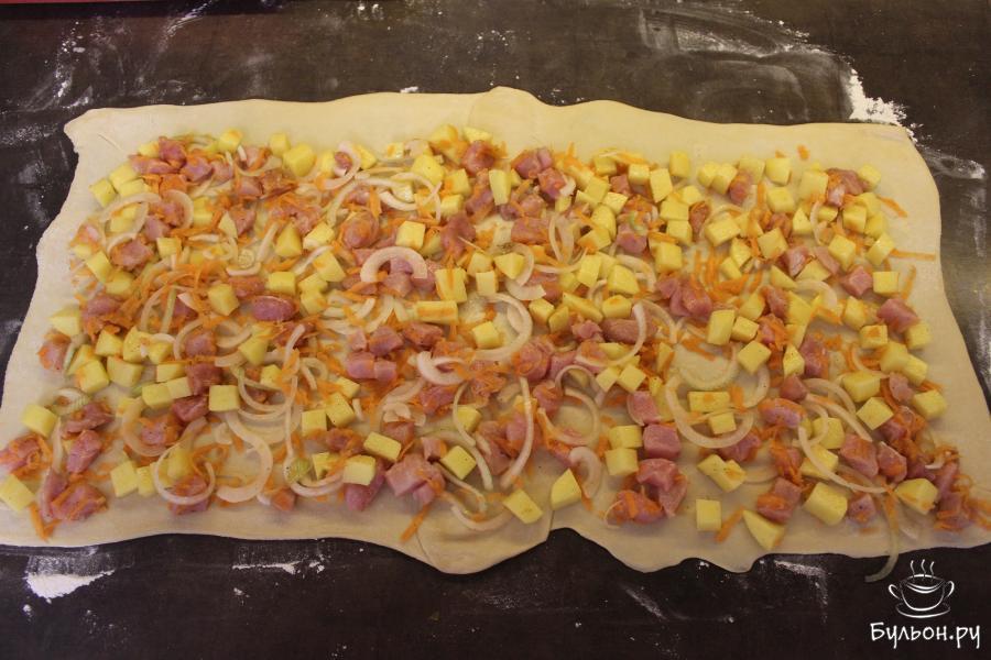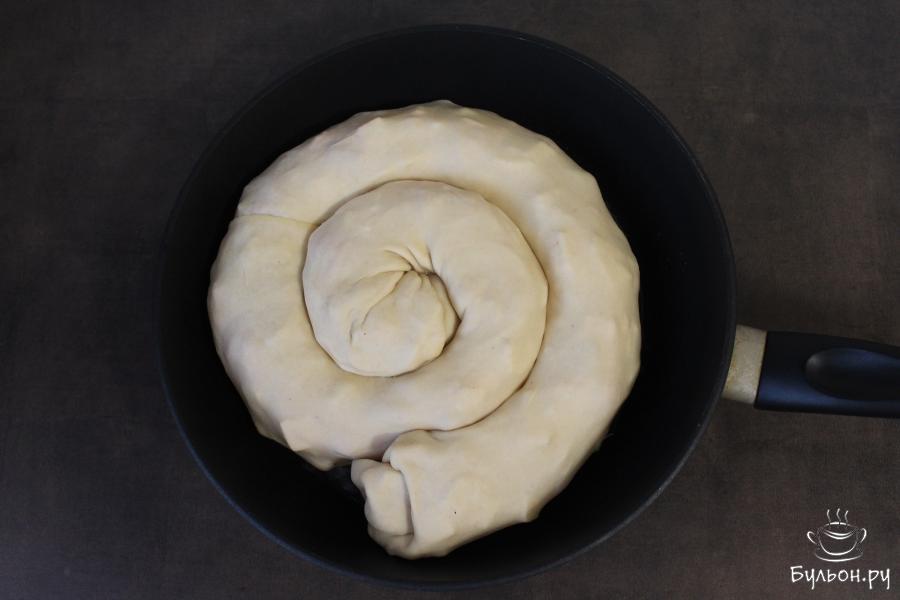 4. Раскатайте тесто в прямоугольный пласт, распределите начинку по поверхности теста, оставив небольшое количество теста без начинки, чтобы при скручивании хорошо залепить край рулета. Скрутите сначала тесто с начинкой в рулет, а затем в улитку.