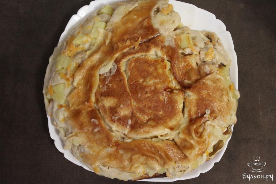 5. Получившуюся улитку выложите на разогретую сковороду и на растительном масле обжарьте, затем переверните улитку и еще немного обжарьте ханум.