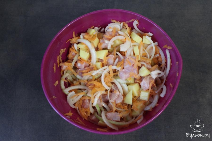 3. Подготовленные продукты переложите в глубокую миску, приправьте перцем и солью, перемешайте руками, так овощи дадут больше сока.