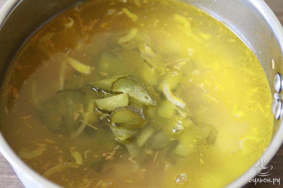 9. Соленые огурцы. Варить рассольник под крышкой на медленном огне 10 минут. По готовности посолить по вкусу.