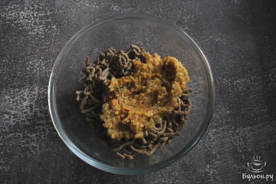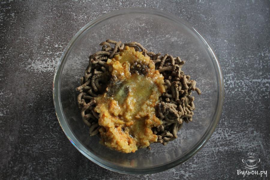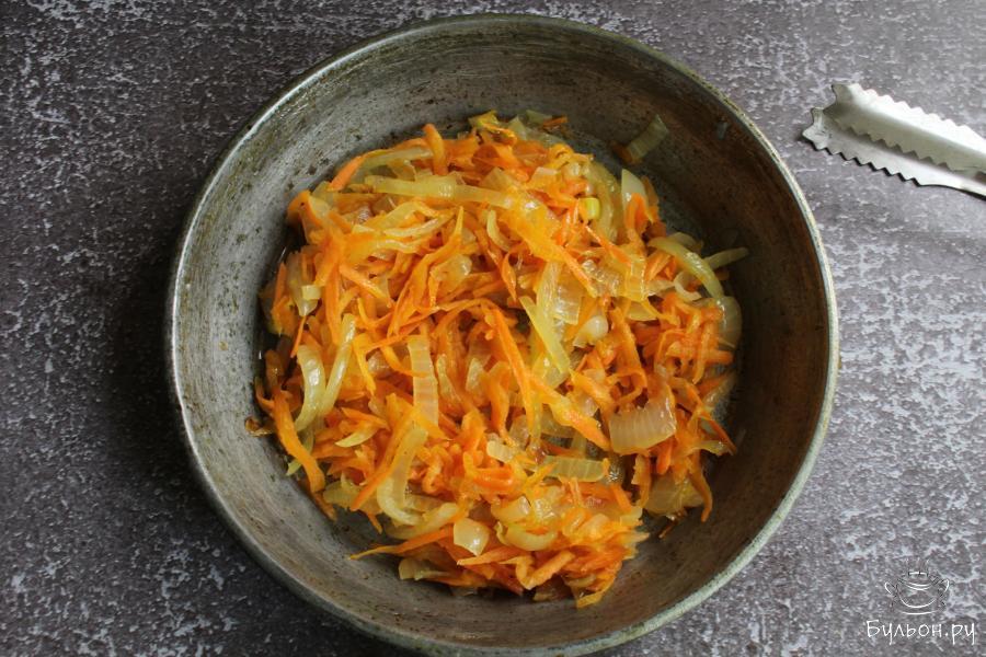 4. Морковь почистить, промыть и перетереть через крупную терку. Добавить морковь к луку и обжарить все вместе 5 минут.