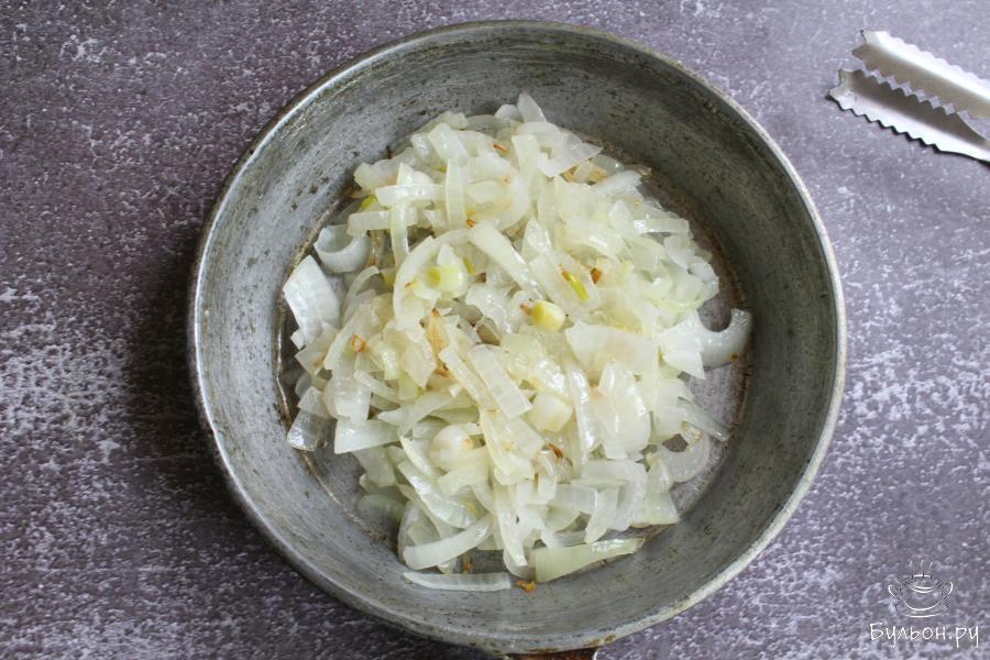3. Лук почистить, промыть, мелко нарезать и обжарить лук, до мягкости, на сковороде с разогретым растительным маслом.