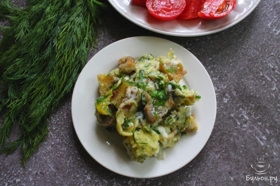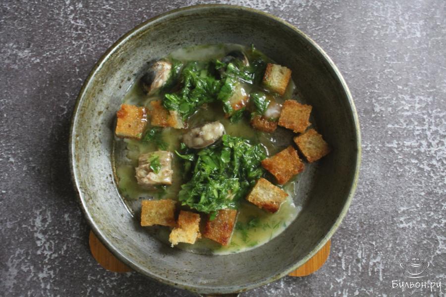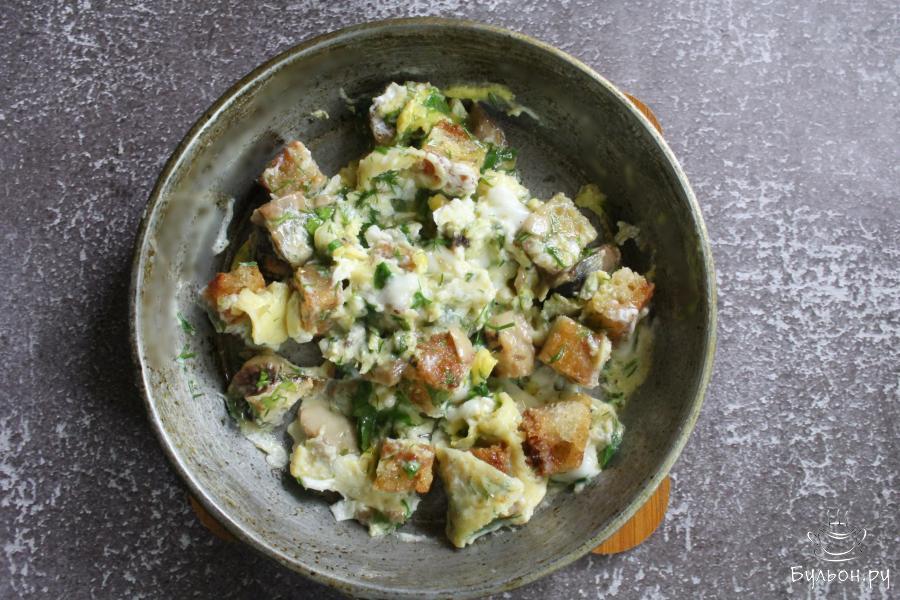 Когда хочется на завтрак приготовить новую яичницу, то этот рецепт придет вам на помощь. Яичница по нему получается необычная, пикантная, вкусная, легкая, но, и одновременно сытная. Кусочки хлеба в яичнице будут хрустящие, но если вы любите, чтобы хлеб был мягкий, то надо дать яичнице немного постоять в готовом виде, хлеб размягчится. Готовится яичница как всегда просто и быстро. Для приготовления подойдут любые рыбные консервы в масле. Зелень для приготовления выбирайте свою любимую. Яичница вкусная в горячем и в холодном виде.