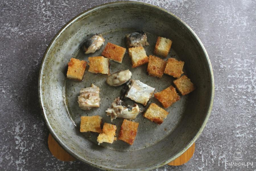 1. Хлеб нарезать на небольшие кубики и обжарить на сковороде с разогретым маслом, со всех сторон, до румяного цвета.