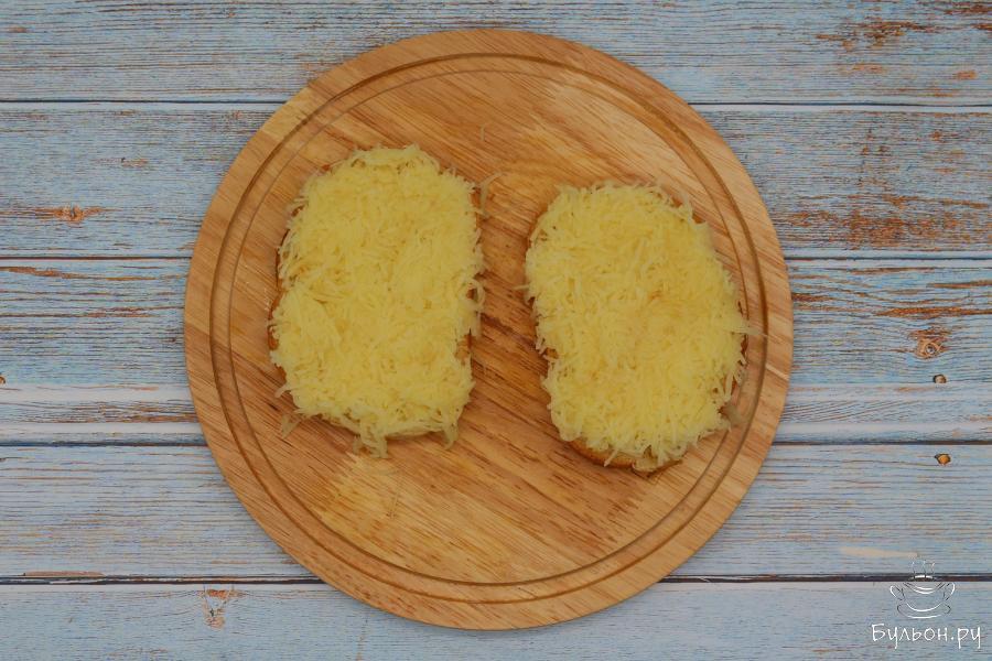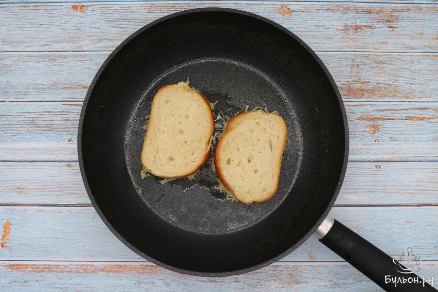 5. Переверните бутерброды с картофелем на другую сторону и обжаривайте еще минуту, чтобы немного подрумянить батон. По желанию бутерброды украсьте и подавайте к столу горячими.