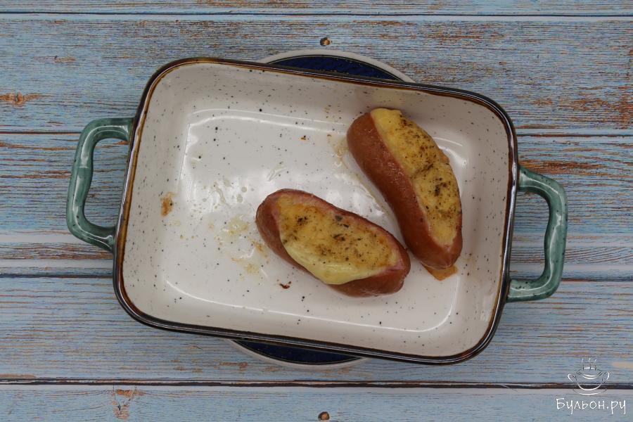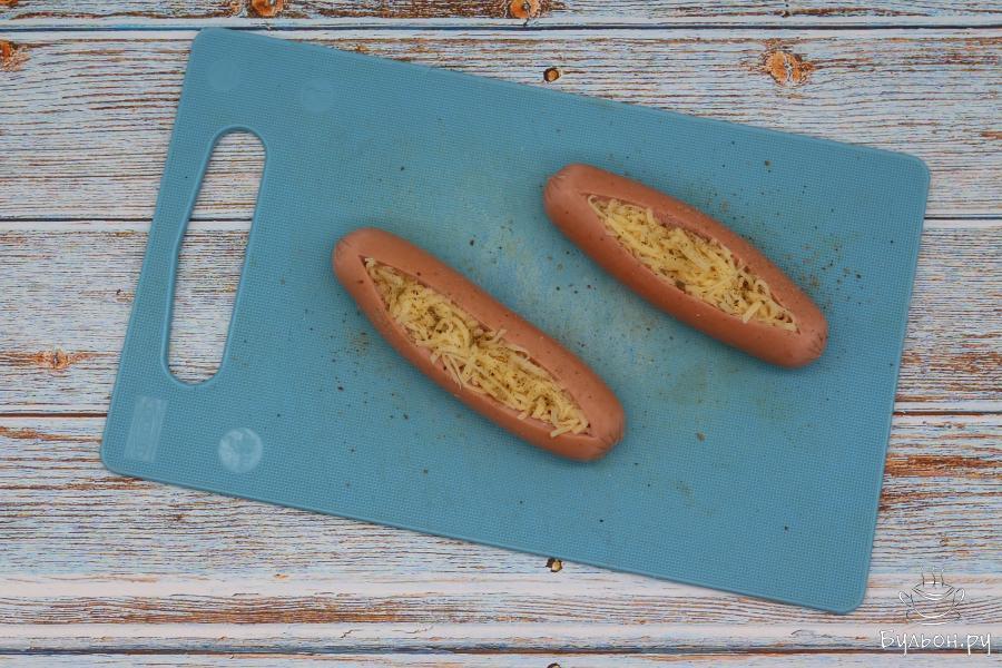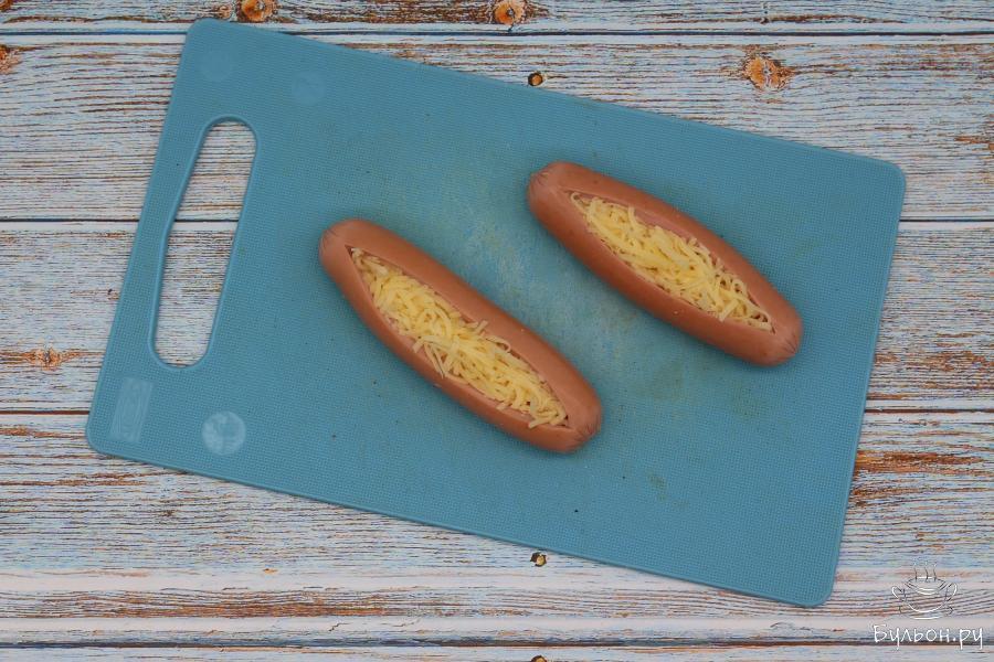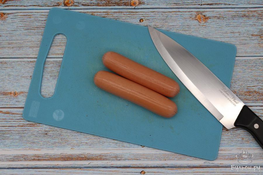 1. Для этого блюдо лучше использовать обычные сосиски, без жирка, копчености и других добавок. Сосиски очистите от пленки и сделайте в каждой глубокий надрез вдоль, не дорезая их до самых краев.