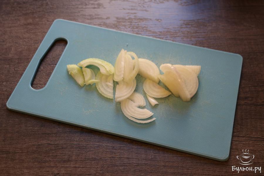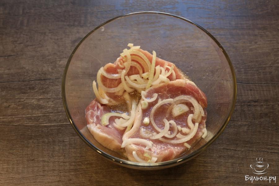 3. Выложите в емкость эскалопы и лук. Перемешайте и оставьте мариноваться на 1,5 часа. Время от времени переворачивайте кусочки мяса, чтобы они равномерно промариновались.