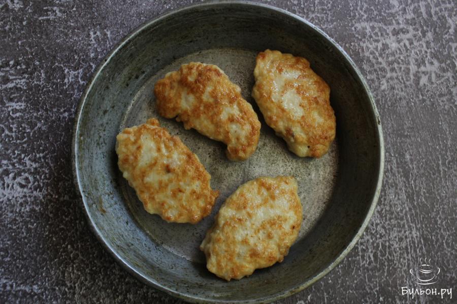 6. Жарить котлеты на сковороде с разогретым растительным маслом. Жарить по 3-4 минуты с каждой стороны. Формировать котлеты удобно столовой ложкой.