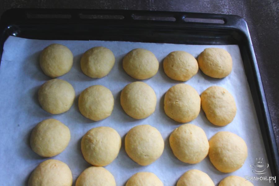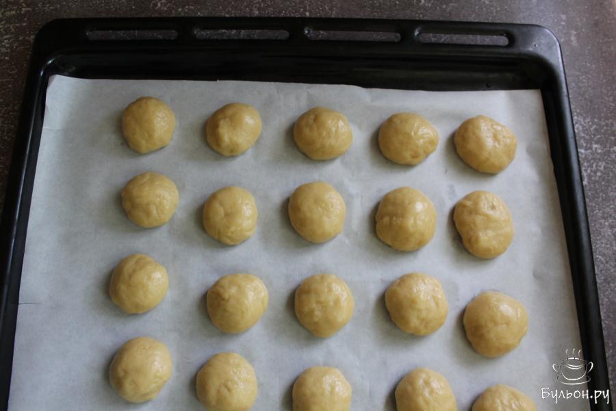 7. Руки смазать маслом, отщипывать небольшие кусочки теста и формировать шарики. Выложить пряники на противень.