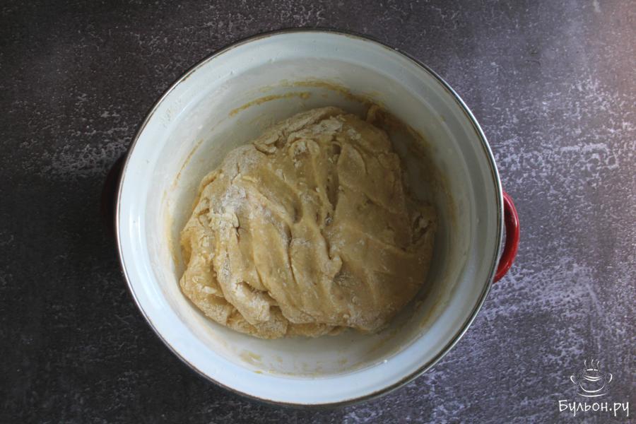 6. Добавить в воду муку и замесить тесто. Муки может уйти немного больше, тесто должно быть мягкое и оно может немного липнуть.