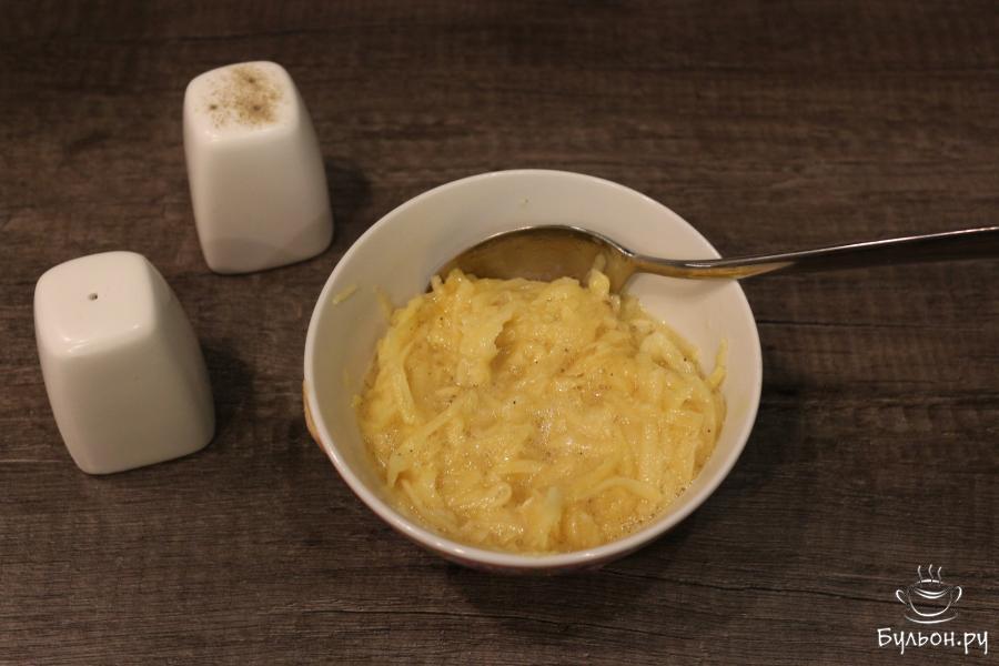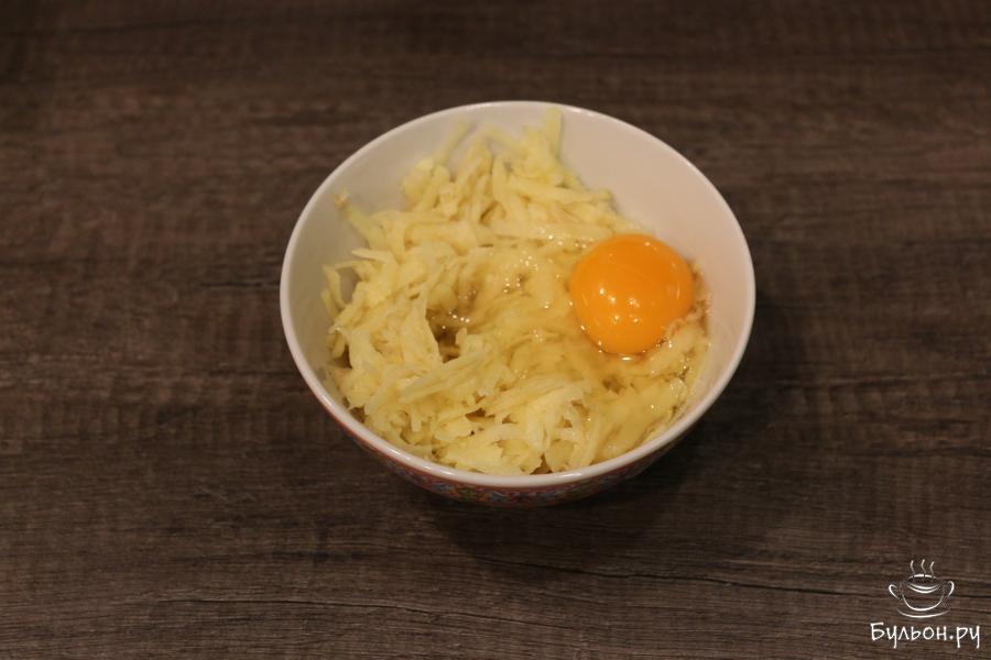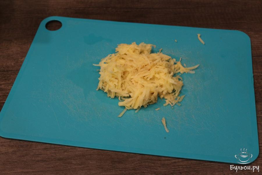 2. Картофель и яйцо я использовала небольших размеров. Картофель очистите от кожицы, натрите на крупной терке. Переложите его в мисочку.