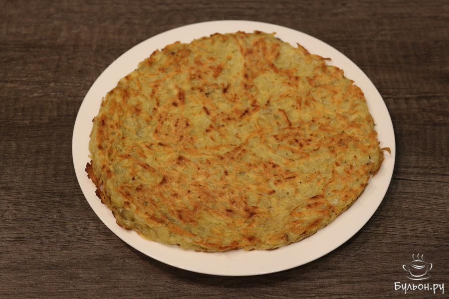 7. Картофельный омлет обжарьте на среднем огне, до образования золотистого цвета с обеих сторон. Переверните аккуратно, чтобы он остался цельным. Готовый омлет переложите на тарелку. Подайте со сметаной.
