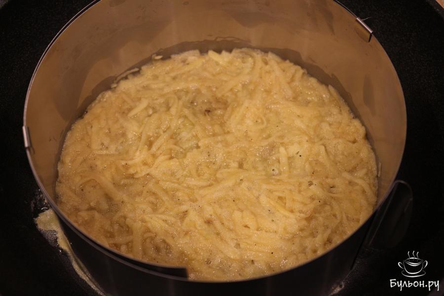 6. Для красоты и ровности омлета установите кондитерское кольцо в центр сковороды. Распределите картофельно-яичную массу равномерно по всему кругу кольца. Диаметр омлета у меня составил 19 см.