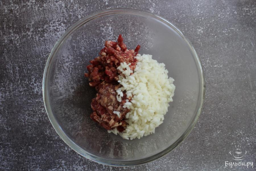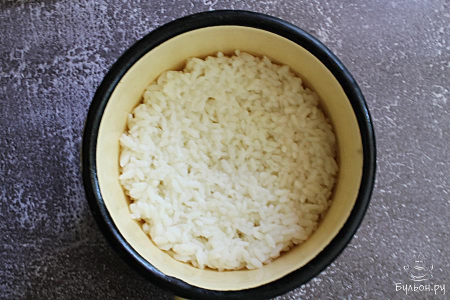 1. Рис промыть, добавить 200 мл. воды и сварить до полуготовности, на это уйдет минут 10. Если вода останется, слить.