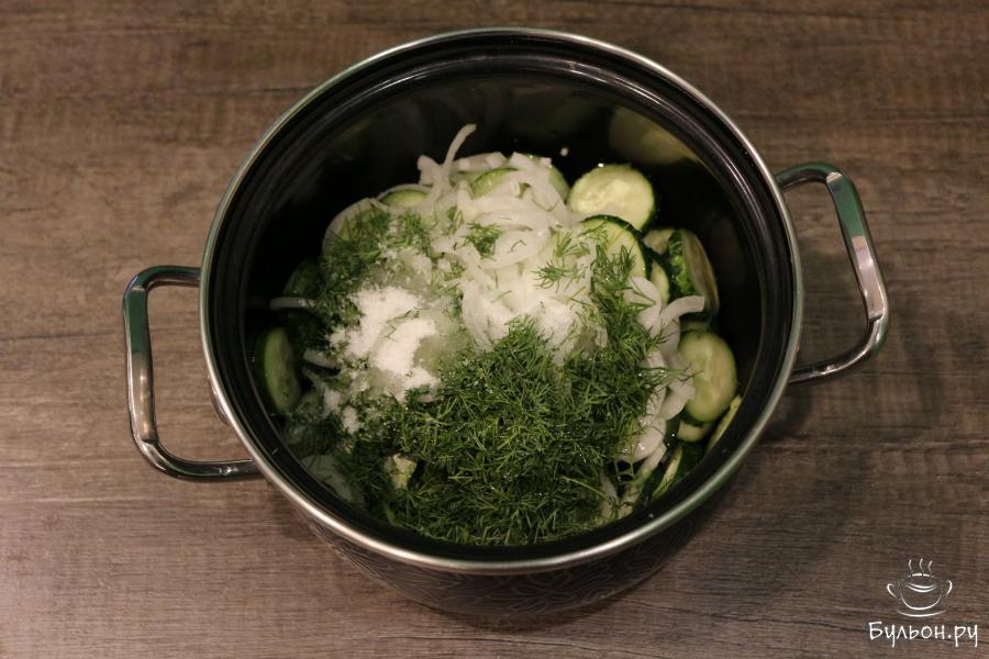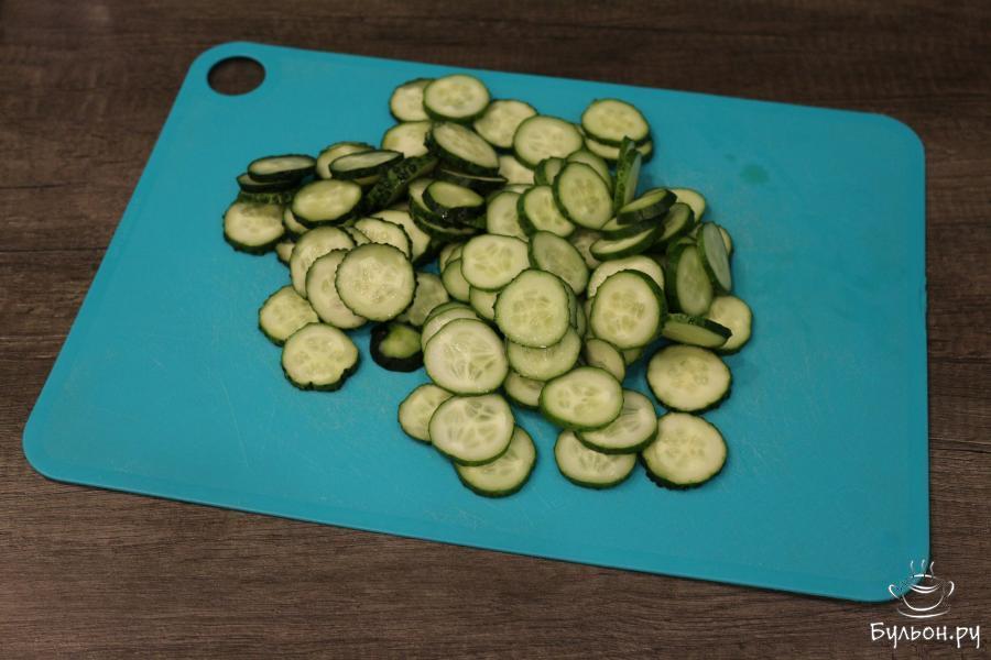 1. Огурцы вымойте и нарежьте кружочками. Салат получится более красивым, если огурцы будут примерно одинакового размера и нарезаны одинаковой толщины. Для этого я использовала слайсер со специальной насадкой.
