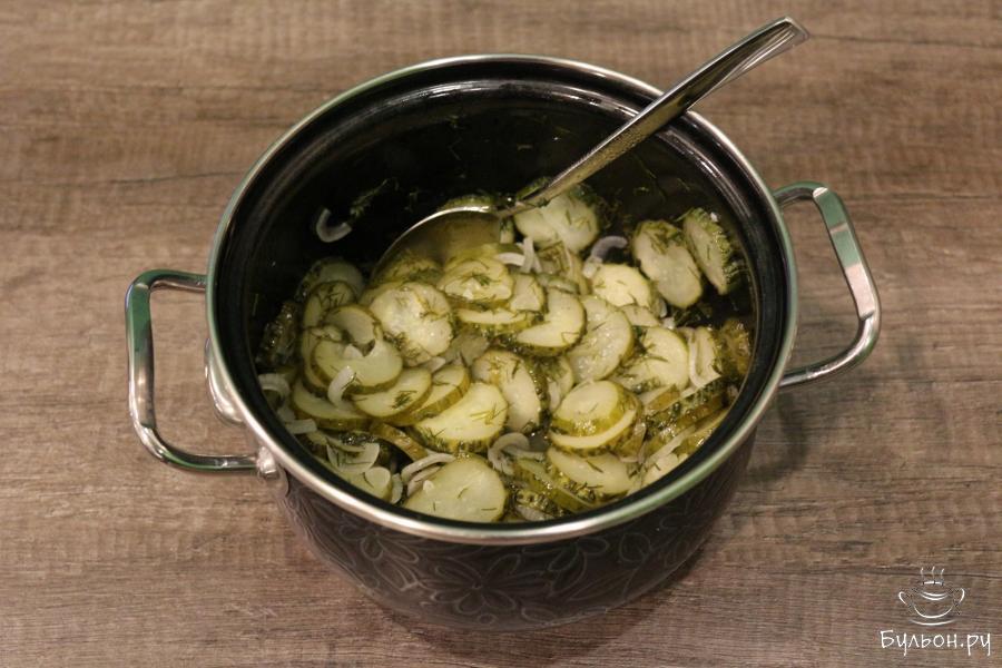 6. Поставьте кастрюлю на огонь. На сильном огне доведите до кипения, затем сделайте огонь умеренным и готовьте огурцы в течение 7 минут, периодически перемешивая их. Делайте это аккуратно, чтобы огурцы сохранили свою форму.