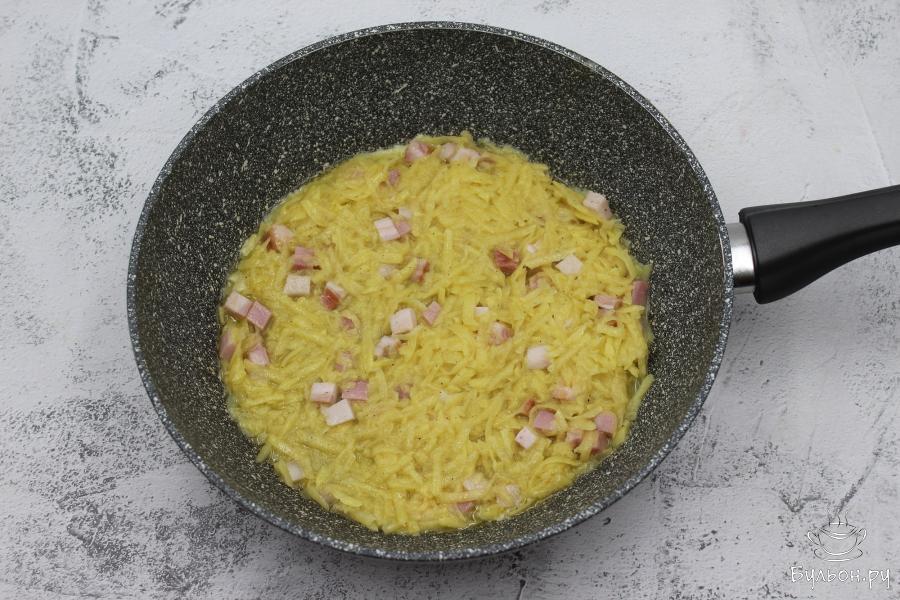 4. На сковороде растопите сливочное масло, затем выложите картофельную массу и аккуратно разровняйте ее лопаткой.