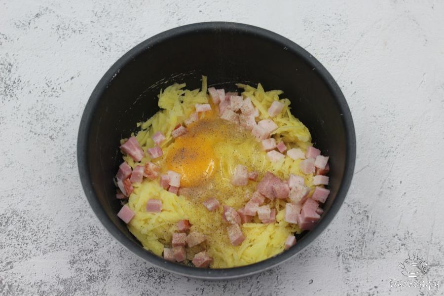 1. Картофель очистите, промойте под водой, обсушите и натрите на крупной терке. Переложите натертый картофель в миску.